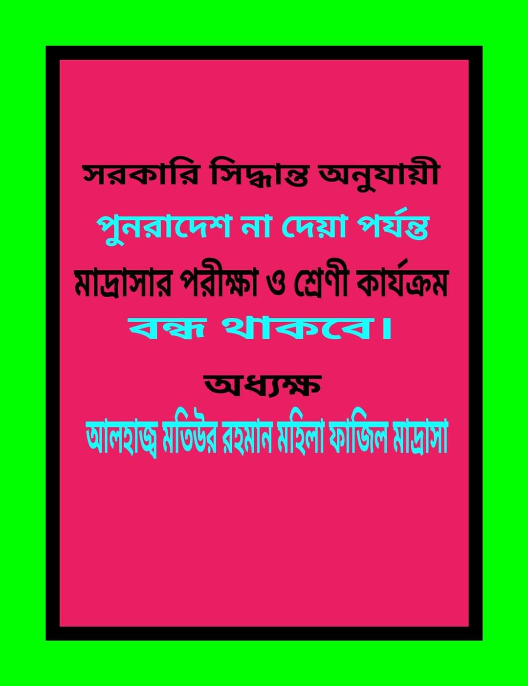 সরকারি সিদ্ধান্ত অনুযায়ী পুনরাদেশ না দেয়া পর্যন্ত মাদ্রাসার পরীক্ষা ও শ্রেণী কার্যক্রম বন্ধ থাকবে
